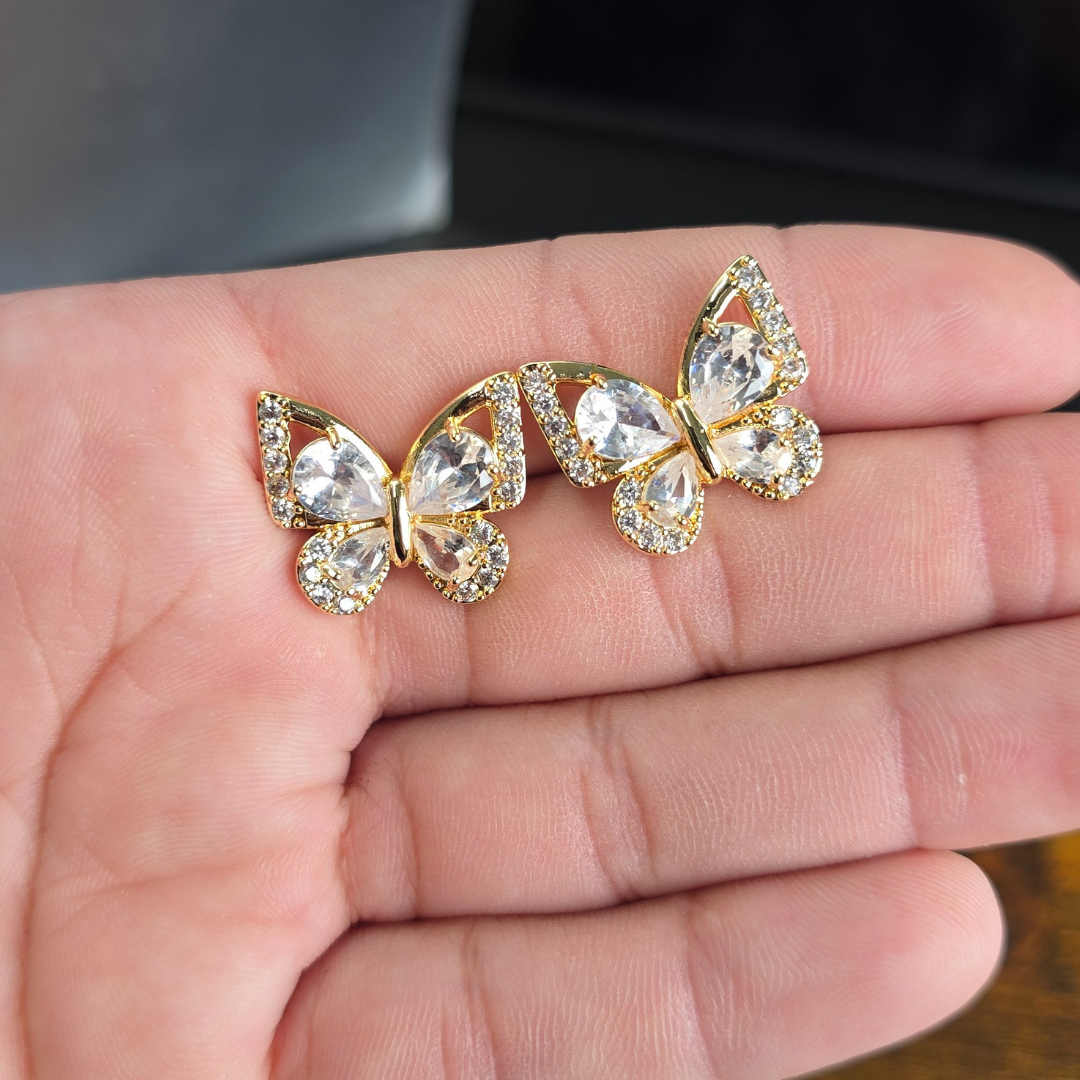 Estos aretes statement capturan la belleza delicada de una mariposa con diseño sofisticado y cristales deslumbrantes de alta calidad. Cada mariposa presenta cuatro cristales blancos transparentes facetados en forma de lágrima que forman las alas superior e inferior, creando efecto brillante similar a diamantes que captura la luz desde todos los ángulos espectacularmente. Cada cristal está engarzado individualmente en marco dorado y rodeado completamente por pequeñas circonitas brillantes que añaden definición, dimensión y brillo multiplicado al diseño.