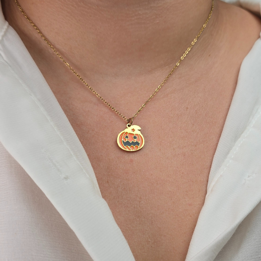 Este collar de acero inoxidable presenta un diseño Halloween encantador con una calabaza esmaltada en naranja vibrante con carita tallada tipo jack-o-lantern y un pequeño sombrero dorado en la parte superior. Su expresión alegre lo hace perfecto para celebrar Halloween de forma divertida sin ser aterrador. Su acabado dorado pulido garantiza durabilidad y resistencia al desgaste, ideal para lucir durante toda la temporada de octubre. La calabaza representa celebración, tradición otoñal y diversión festiva, perfecta para fiestas de Halloween o para quienes disfrutan del lado más alegre de esta festividad.