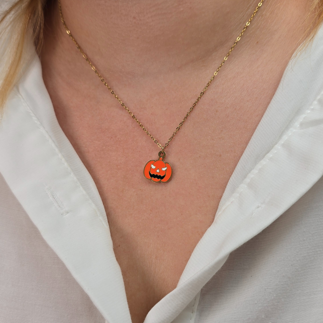 Descripción: Collar con divertido diseño de calabaza de Halloween esmaltada naranja con expresión traviesa en cadena dorada simple, fabricado en acero inoxidable. La cadena de acero inoxidable asegura durabilidad y estilo moderno, mientras que la calabaza esmaltada con carita pícara le da un toque de diversión única y espíritu Halloween juguetón. Ideal para temporada de Halloween, fiestas de disfraces, amantes de lo festivo o expresar personalidad traviesa, este collar es la elección perfecta para un estilo Halloween divertido y desenfadado.