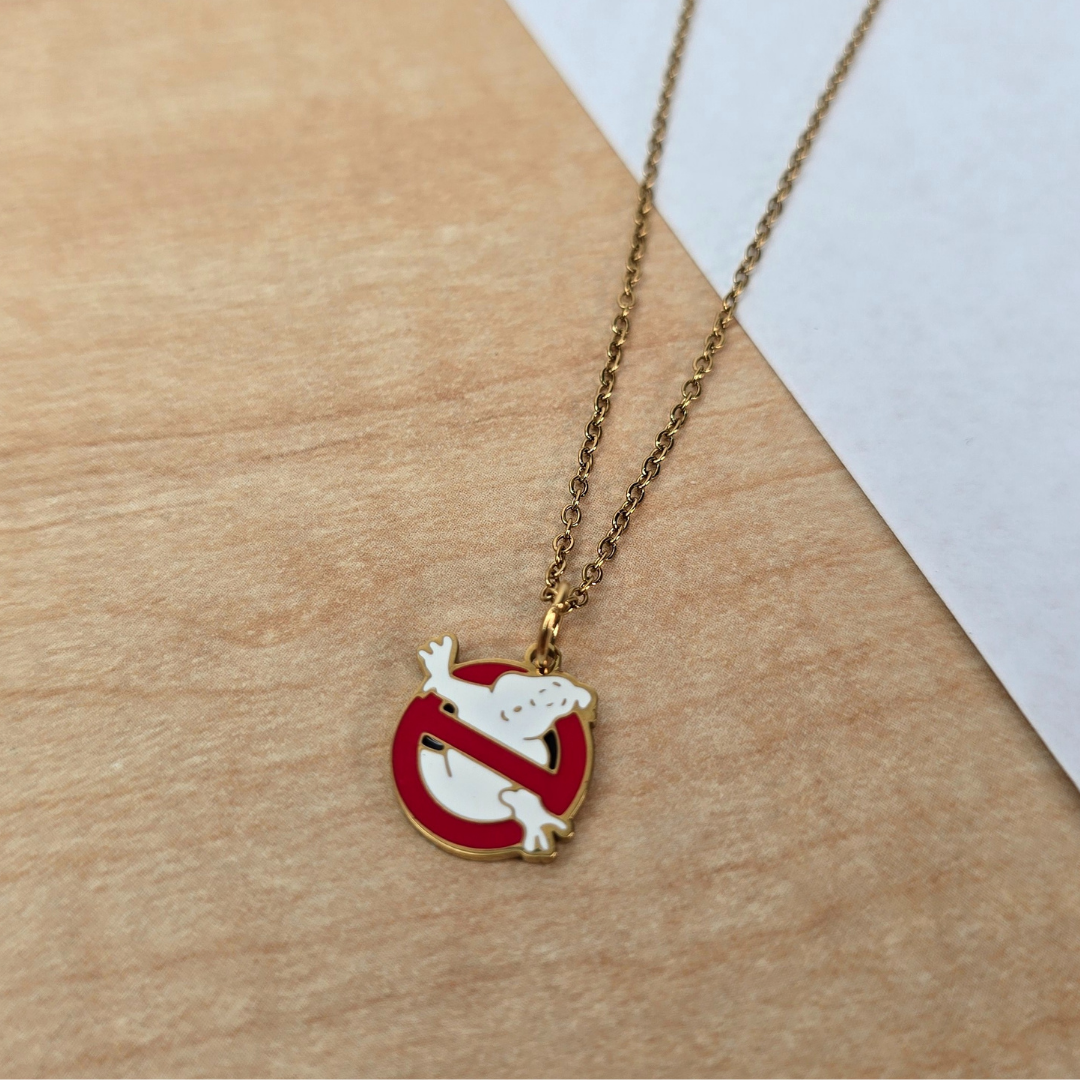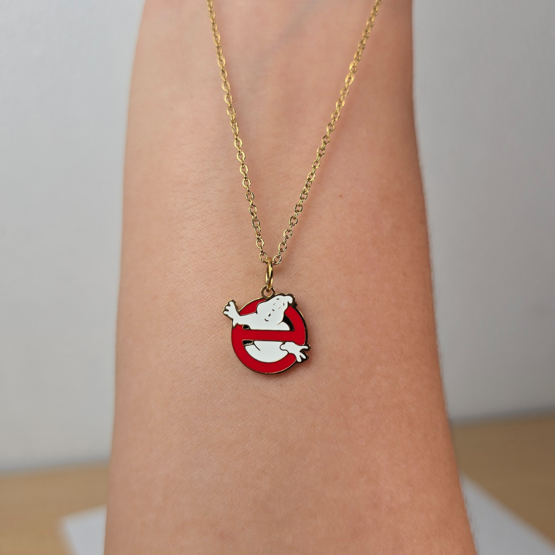 Descripción: Collar con icónico diseño del logo de Cazafantasmas con fantasma blanco y círculo rojo prohibido en cadena dorada, fabricado en acero inoxidable. La cadena de acero inoxidable asegura durabilidad y estilo moderno, mientras que el logo esmaltado le da un toque de nostalgia única y cultura pop. Ideal para fans de Cazafantasmas, amantes de cultura pop de los 80s, looks retro o expresar amor por la película clásica, este collar es la elección perfecta para un estilo nostálgico y divertido.