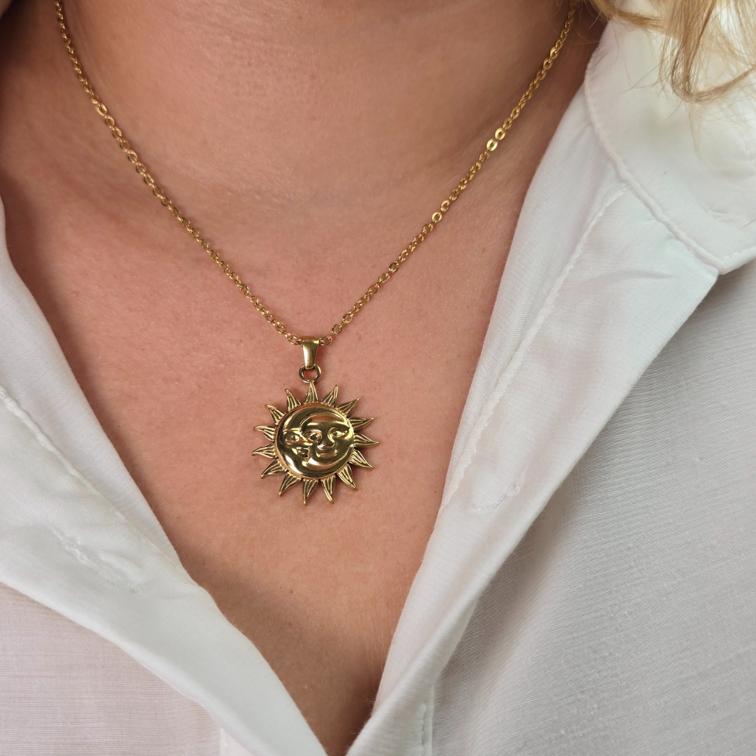 Este collar de acero inoxidable presenta un diseño bohemio profundo con un sol y luna unidos en una sola pieza, donde el sol tiene rayos texturizados y ambos incluyen rostros con detalles faciales que representan dualidad y balance. Su diseño simbólico lo hace perfecto para quienes buscan joyería con significado más allá de la estética. Su acabado dorado pulido garantiza durabilidad y resistencia al desgaste, ideal para lucir un estilo espiritual con elegancia. El sol y la luna juntos simbolizan balance, dualidad, energía masculina y femenina, día y noche, perfecto para quienes aprecian el equilibrio y la armonía cósmica.