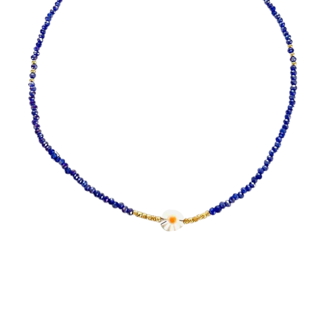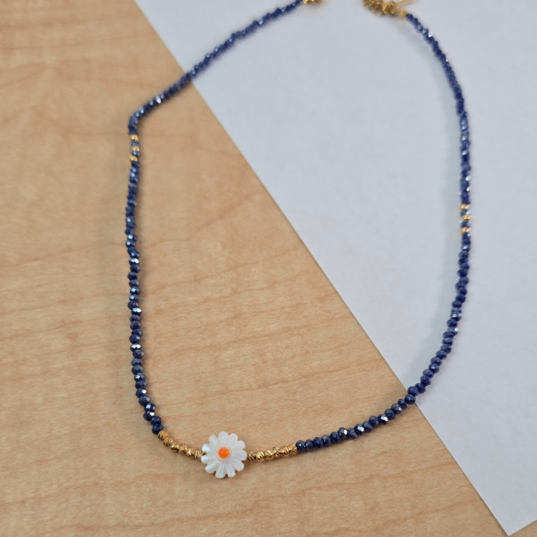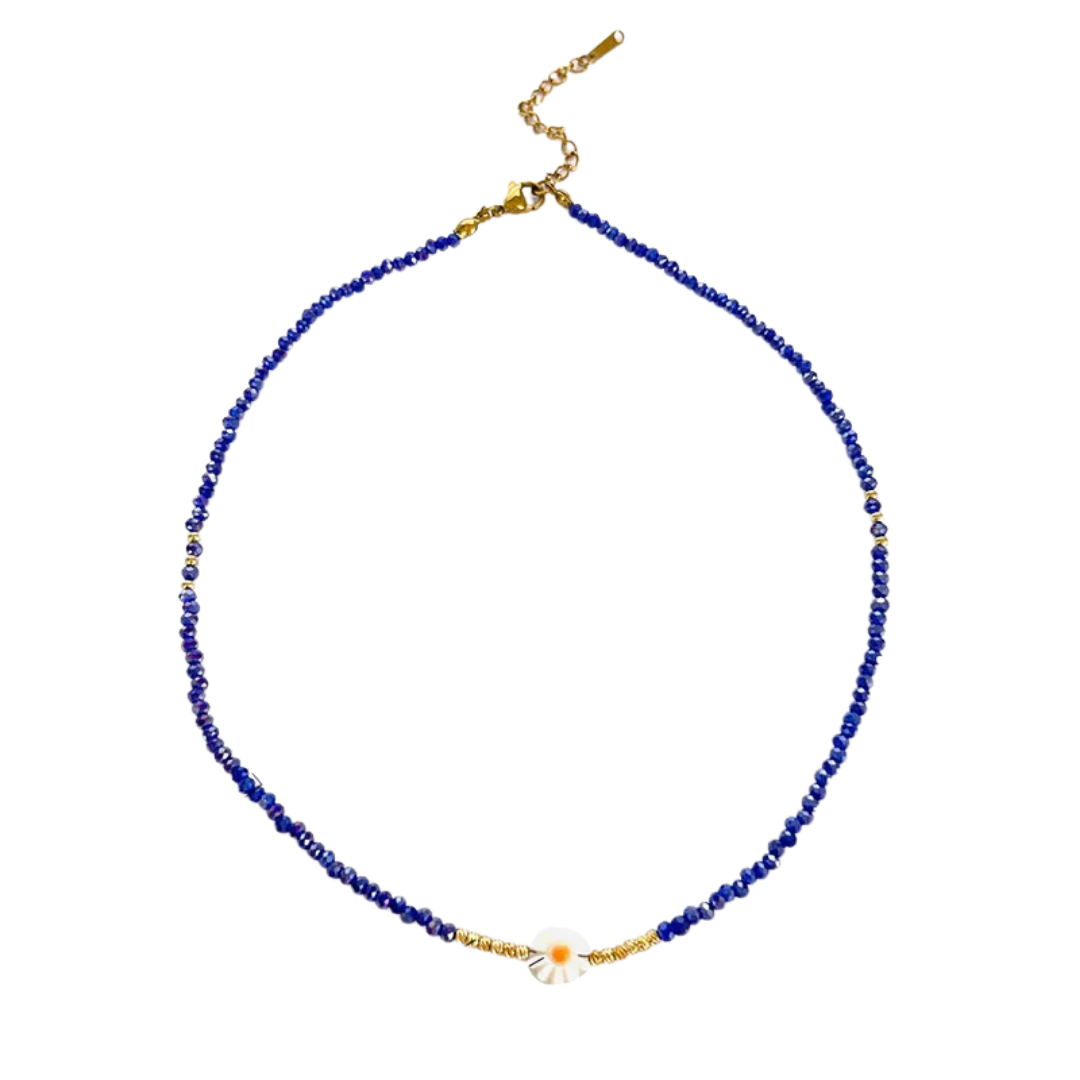 Descripción: Collar con elegante diseño bohemio que combina cristales facetados azules con concha natural naranja y detalles dorados, fabricado en acero inoxidable 316L con baño de oro 18K PVD. Los cristales facetados de 3mm crean brillo uniforme y elegante, mientras que la flor natural de 1.0cm con acentos dorados le da un toque de playa único y conexión oceánica. Ideal para looks bohemios, estilo costero, amantes del océano o expresar personalidad veraniega, este collar es la elección perfecta para un estilo boho-chic marino con materiales naturales.