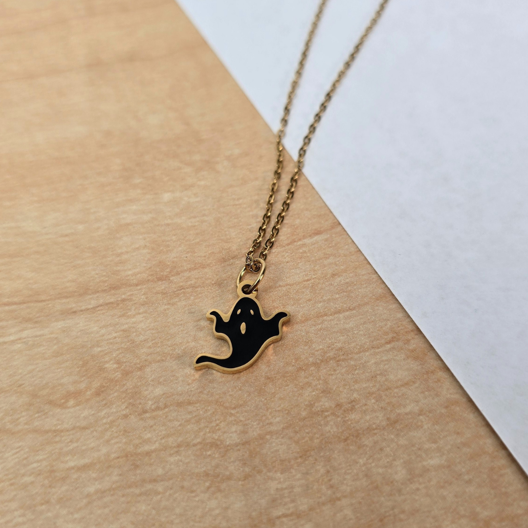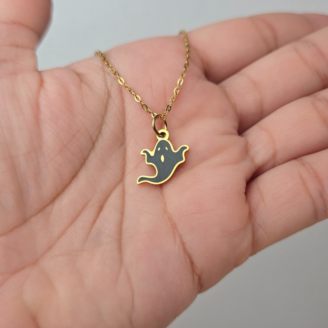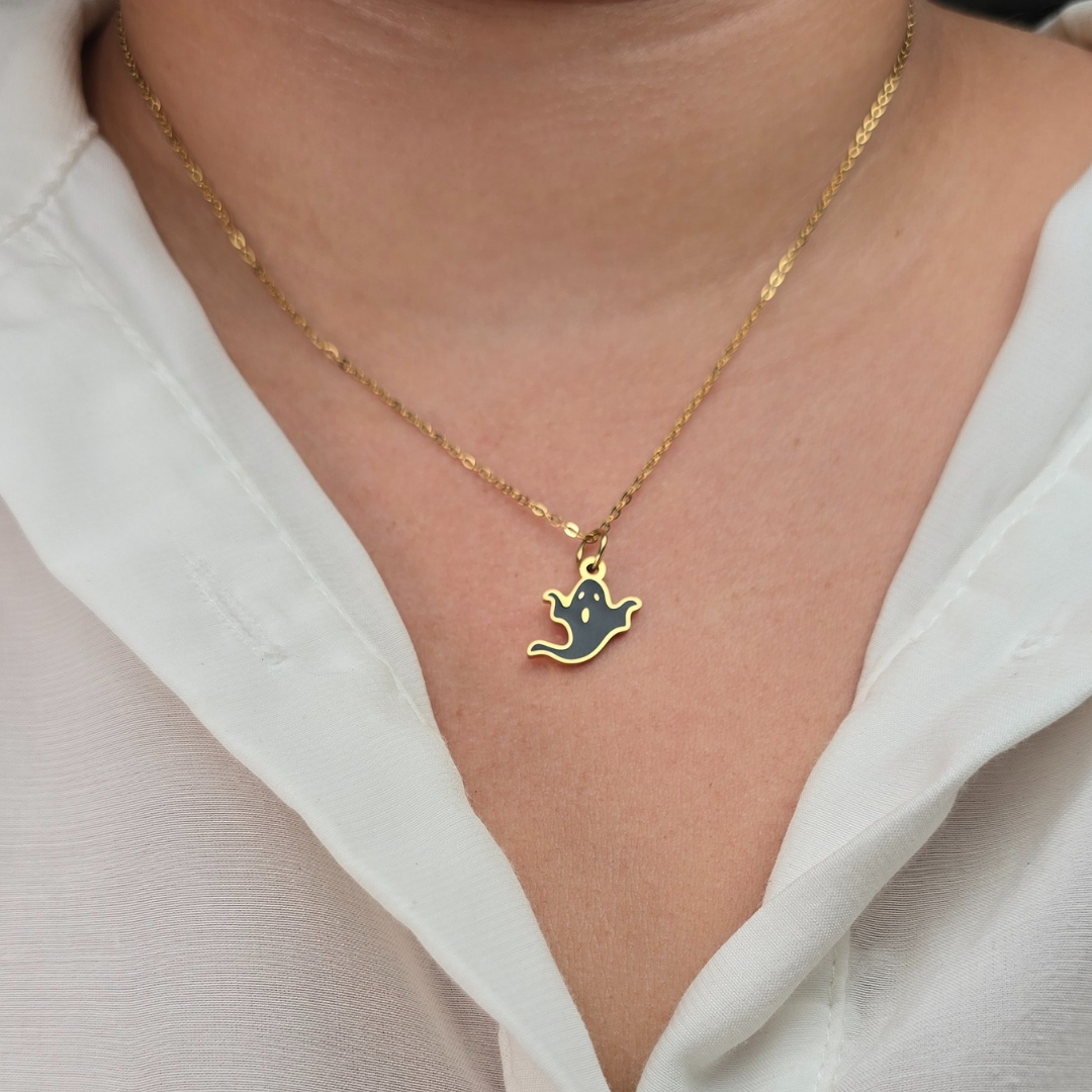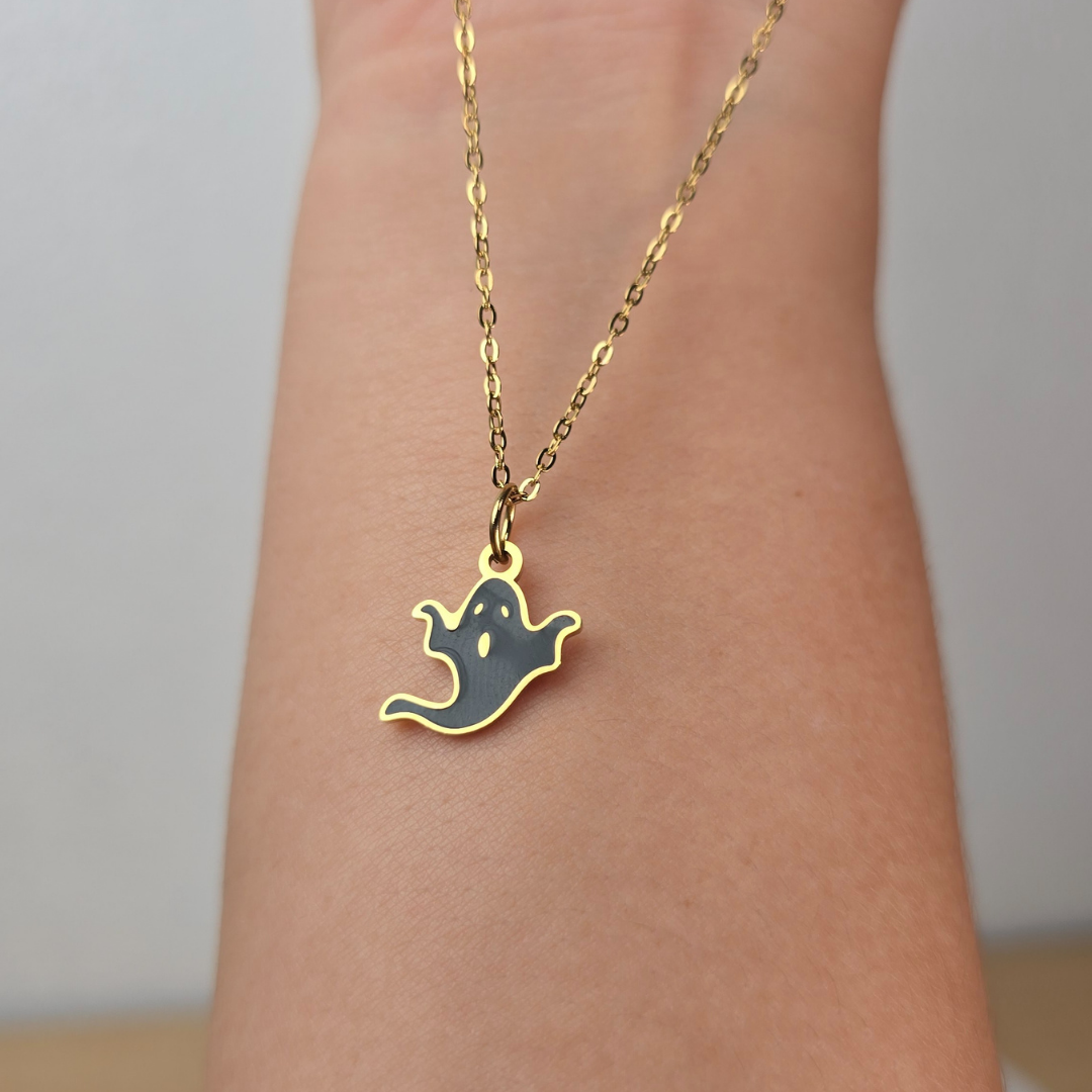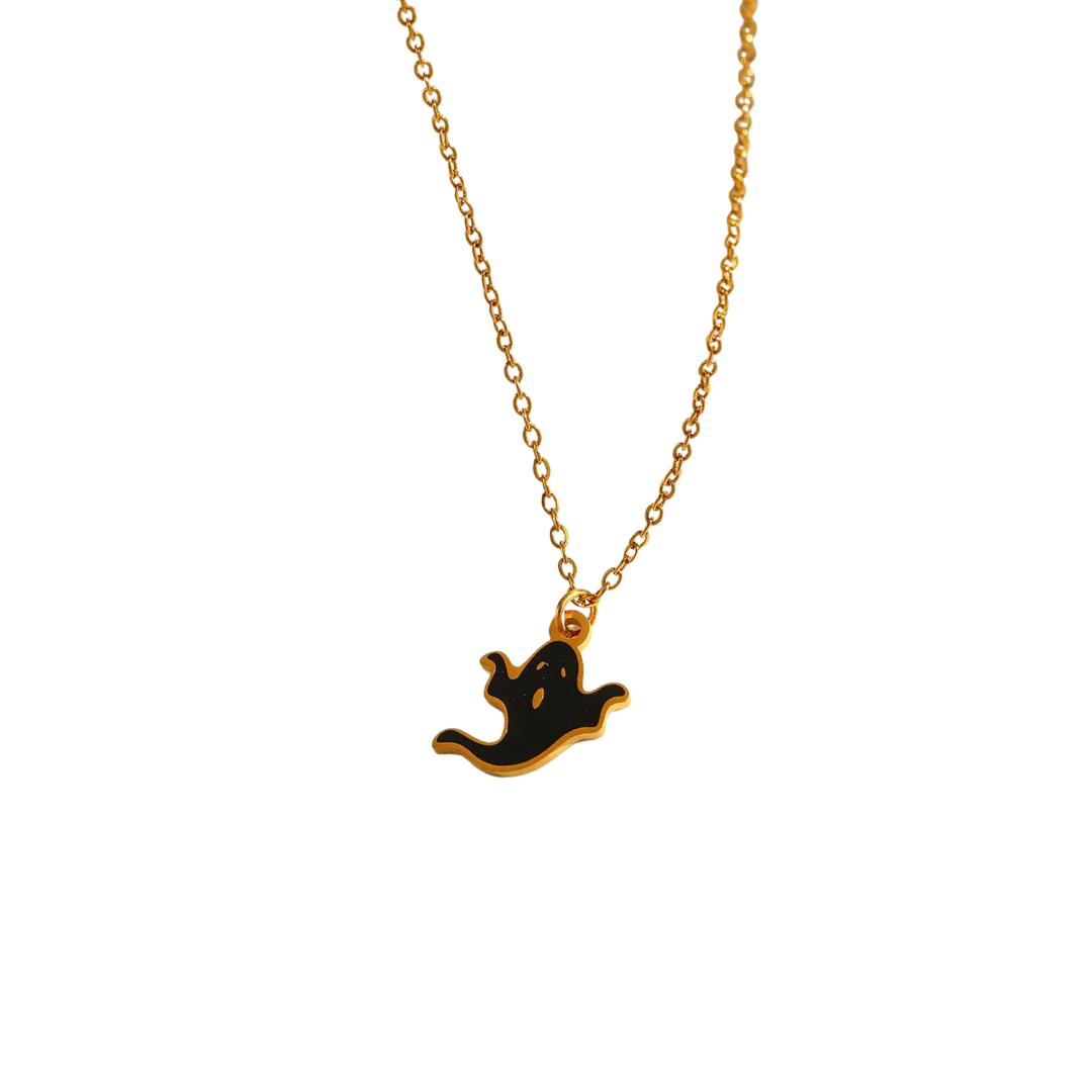 Este collar de acero inoxidable presenta un diseño Halloween encantador con un fantasma esmaltado en negro con ojos calados y forma ondulante que sugiere movimiento. Su diseño minimalista lo hace perfecto para uso diario sin ser excesivamente temático, mientras mantiene ese toque spooky y divertido. Su acabado dorado pulido garantiza durabilidad y resistencia al desgaste, ideal para lucir un estilo alternativo accesible. El fantasma representa lo misterioso, transformación y el lado juguetón de Halloween, perfecto para quienes disfrutan la estética spooky con elegancia contemporánea.