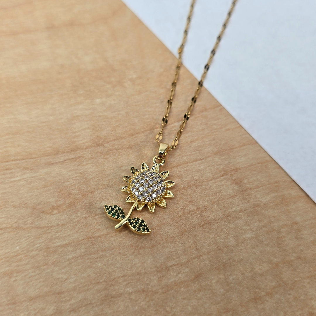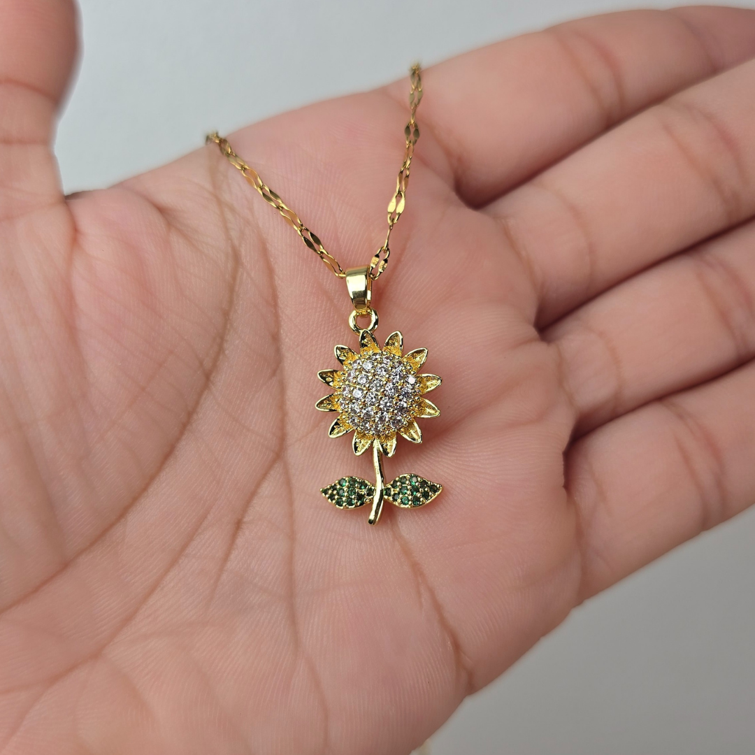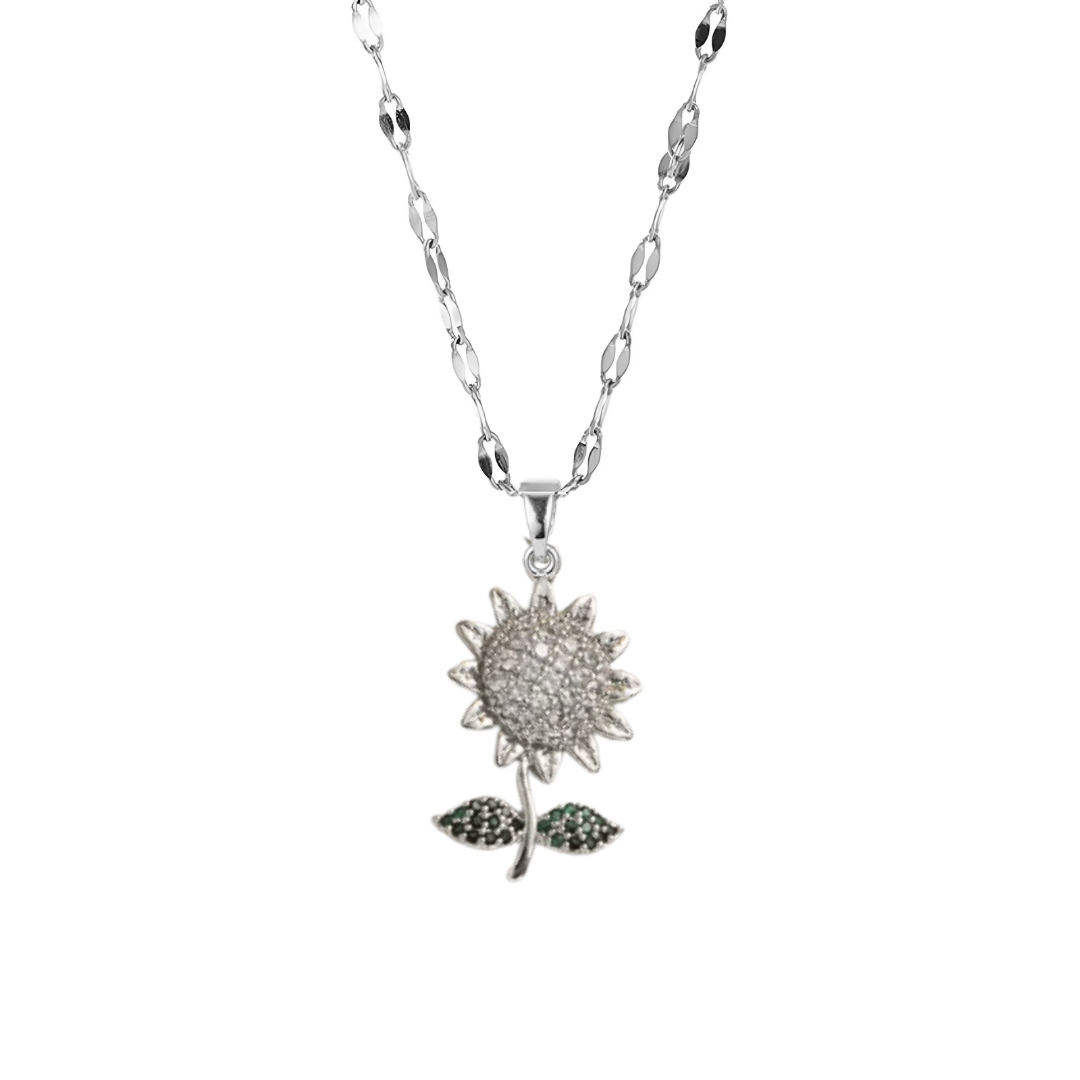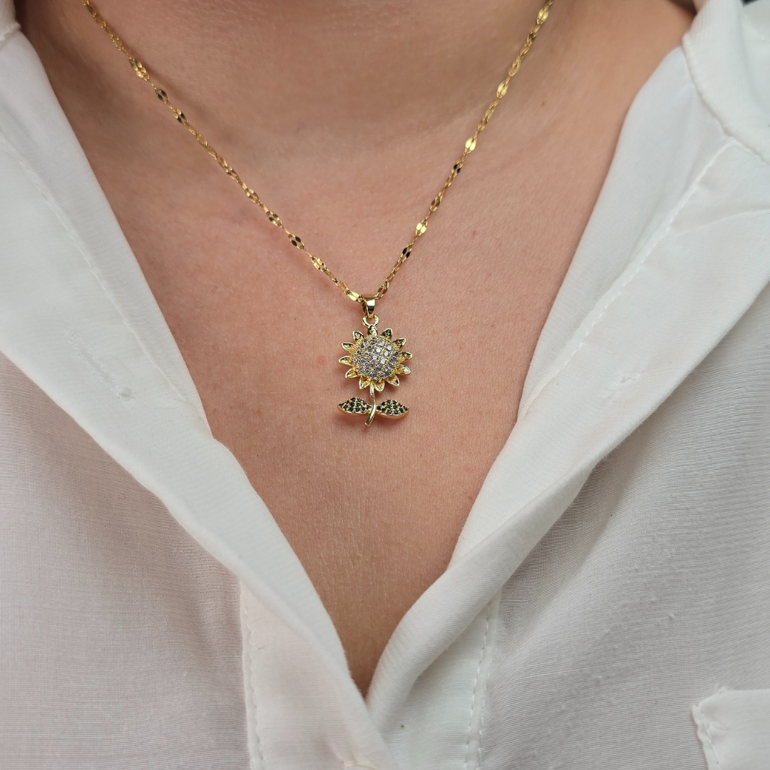 Descripción: Collar con encantador diseño de girasol con cristales brillantes y hojas verdes en cadena plateada delicada, fabricado en acero inoxidable. La cadena de acero inoxidable asegura durabilidad y estilo moderno, mientras que el girasol con cristales transparentes en el centro y hojas con cristales verdes oscuros le da un toque de alegría única y simbolismo positivo. Ideal para amantes de la naturaleza, regalos especiales, estilo bohemio o expresar personalidad alegre, este collar es la elección perfecta para un estilo radiante con significado inspirador en tono plateado elegante.
