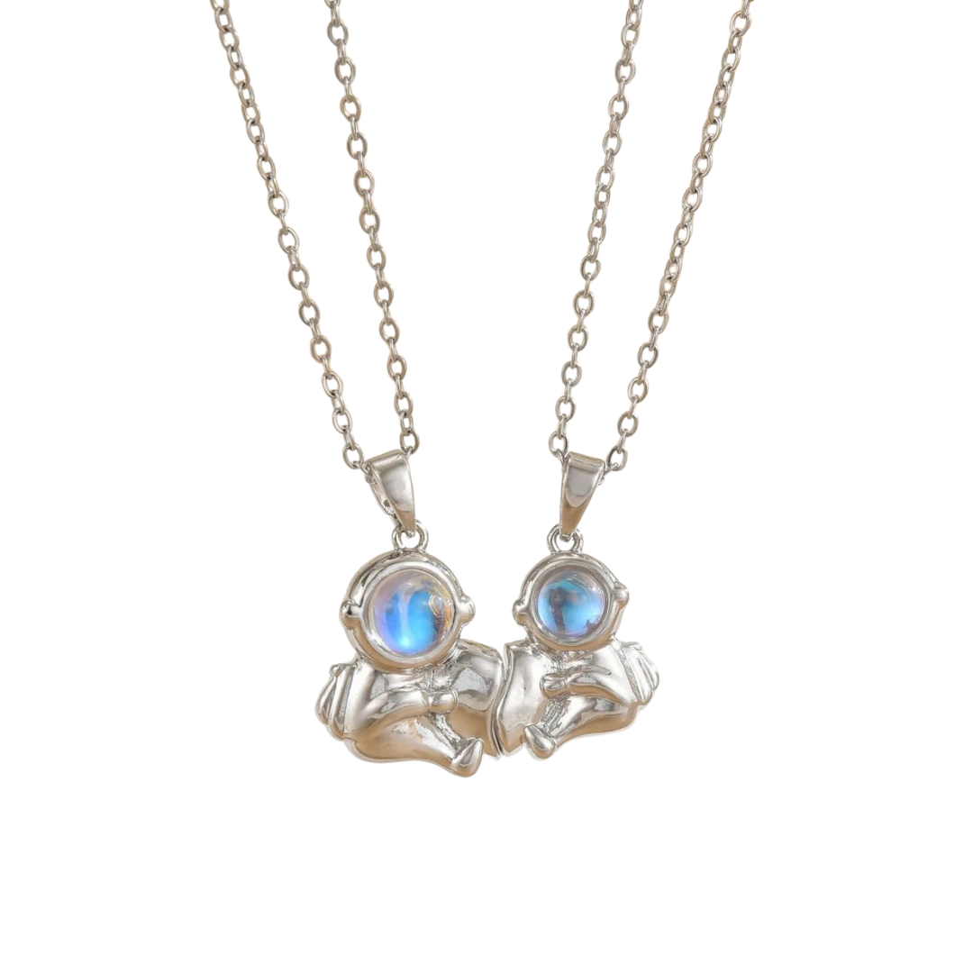 La cadena de acero inoxidable garantiza resistencia y un acabado elegante, mientras el diseño de dos astronautas con piedras azules brillantes simboliza amor, conexión y aventuras sin límites. Ideal para parejas o para quienes aman los detalles únicos y especiales.