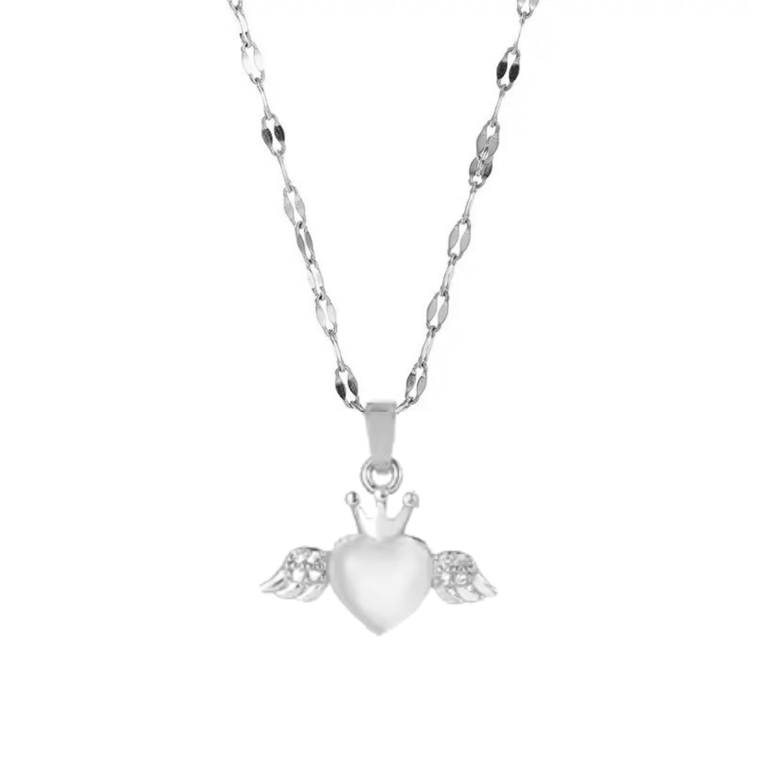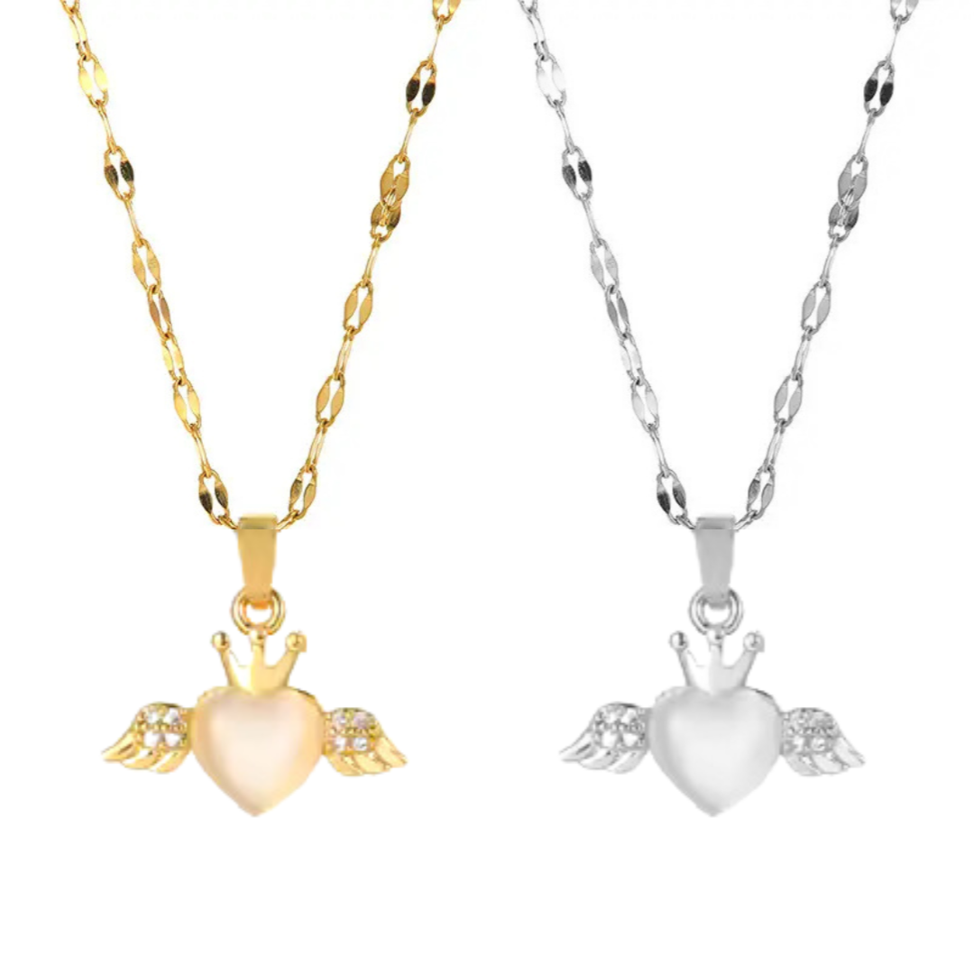 Descripción: Collar con un corazón con alas. La cadena de Stainless steel asegura durabilidad y estilo moderno, mientras que la media luna tornasol añade un toque de elegancia única. Ideal para destacar en cualquier ocasión, este collar es la elección perfecta para tu estilo.